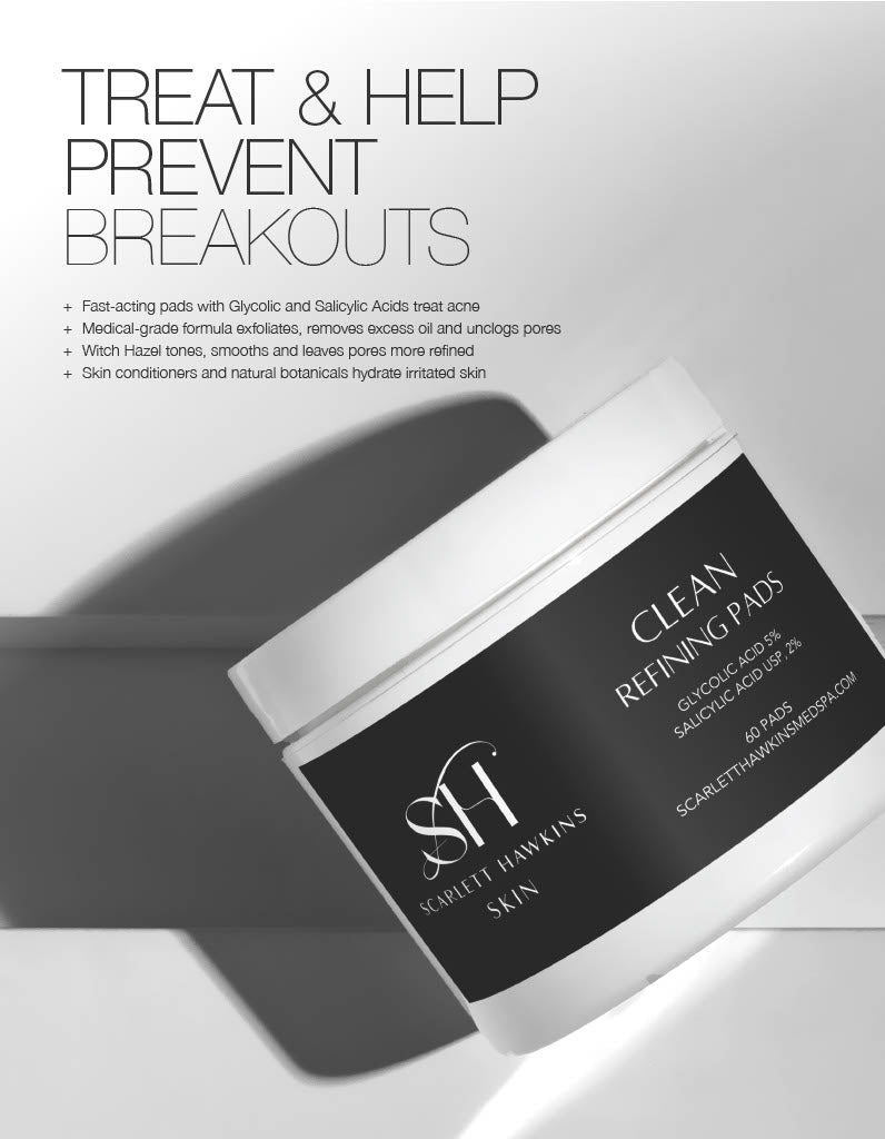 The Scarlett Hawkins Skin CLEAN Refining Pads are part of our Acne Collection. These pH-balanced pads combine salicylic acid to deeply penetrate pores and reduce oil, with glycolic acid to exfoliate dead skin cells and improve texture. They help clear clogged pores, reduce breakouts, and enhance skin clarity without over-drying. Ideal for oily, acne-prone, or congested skin.