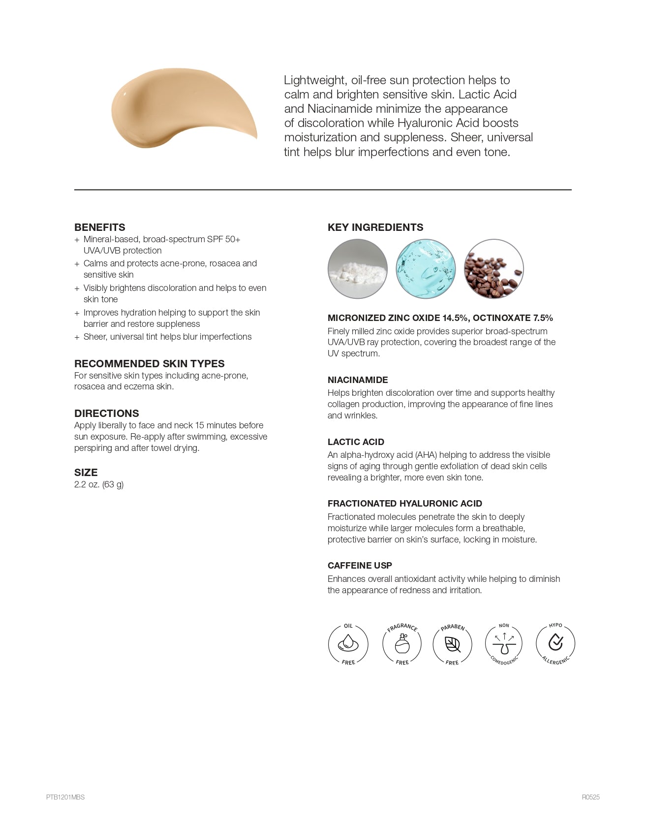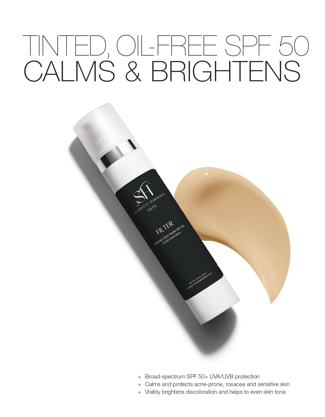 The Scarlett Hawkins Skin Filter SPF 50 is a mineral-based, oil-free sunscreen formulated for acne- and rosacea-prone skin. It provides broad-spectrum UVA/UVB protection while lactic and hyaluronic acids hydrate and calm the skin. Niacinamide visibly brightens, reduces discoloration, and improves blemishes. The sheer universal tint blends with most skin tones and blurs imperfections.